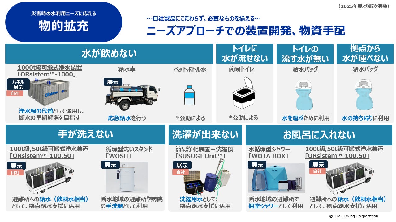 「水支援オペレーション体制」は、災害時の水利用ニーズに応える装備の拡充に加え、物資の備蓄・配備の分散、輸送・設置・施工を担う協力体制の整備、全国のフィールドエンジニアが即応的に集結して支援を担う仕組み、そして支援を統括する災害対策室の常設、社内制度・研修の拡充など、水を届けるための一体的な体制を構築しています。今回出動した給水車は、このうち「物的拡充」の一環として災害時に備えて配備してきた装備の一つであり、災害に限らず渇水という水確保の課題に対しても、必要な場所へ必要なタイミングで水を届ける支援として機能しました。