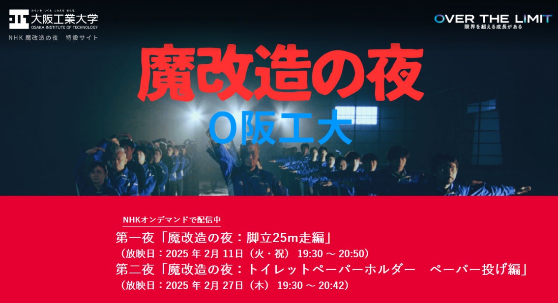 大阪工業大学(学長:井上晋)は2月11日、27日にNHK総合で放送されました人気番組「魔改造の夜」に「O阪工大」として出演しました。同番組は、超一流のエンジニアたちが極限のアイデアとテクニックを競う技術開発エンターテインメント番組で、本学の学生と教職員が一丸となって創り出した“魔物”を披露しました。同番組で紹介された“魔物”や製作の様子を紹介した特設サイトを公開しました。