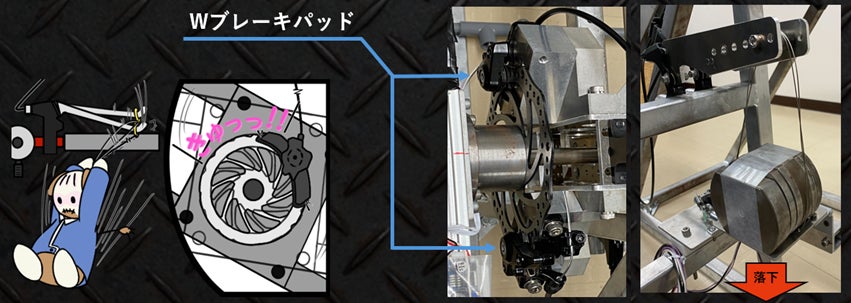 トイレットペーパー放出後にモンスターが大回転するとトイレットペーパーを巻き込むため、放出後の大回転を止める必要があります。急停止するために、自転車のディスクブレーキを採用し、放出時に重りを落下させ、ハンドブレーキを引く仕組み。ダブルのブレーキパッドをワイヤーで締め付けディスクブレーキにより急停止します。