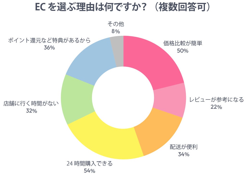 「ECが多い」「どちらも同じくらい」と回答した計 35% に対して、ECを選ぶ理由についても調査。