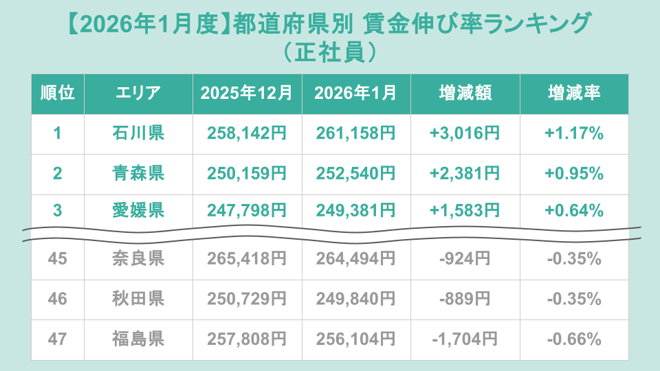 正社員の都道府県別賃金伸び率ランキング(前月比)トップ3は、1位が石川県(増加額+3,016円、増加率+1.17%)、2位が青森県(増加額+2,381円、増加率+0.95%)、3位が愛媛県(増加額+1,583円、増加率+0.64%)でした。
