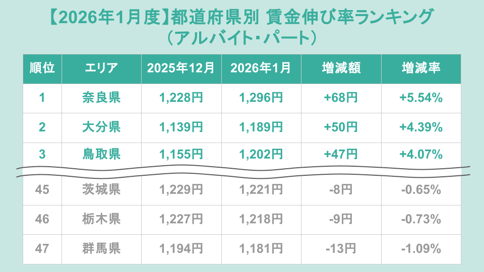 求人サイト主要9媒体から雇用形態別に分析!奈良県が前月比+5.54%で1位【2026年1月度 都道府県別 賃金伸び率ランキング】
