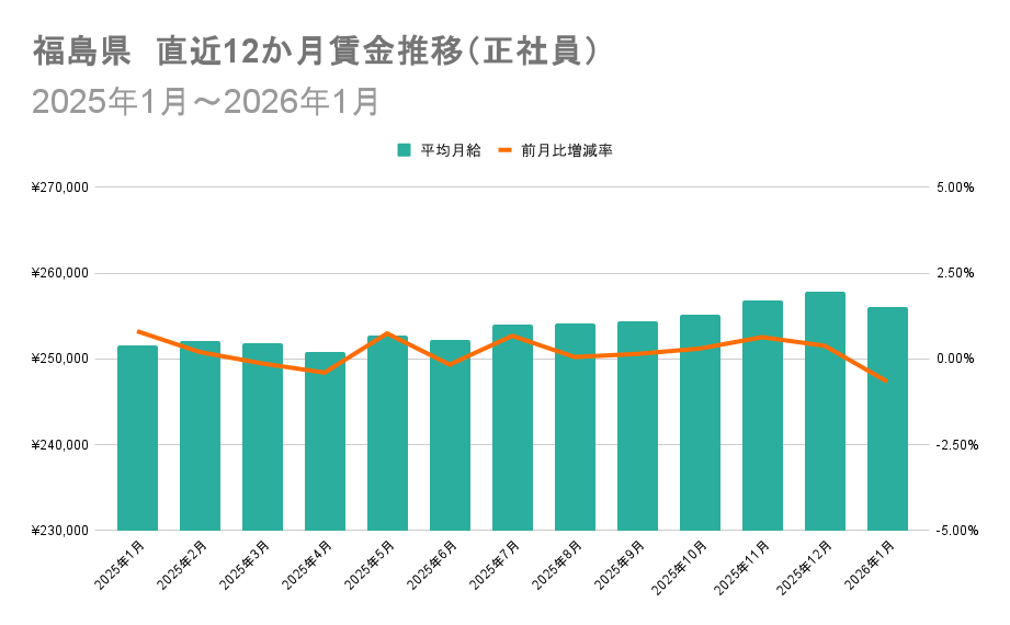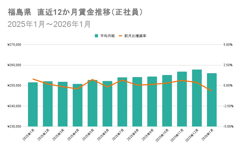 福島県の平均月給は、2025年1月から2025年12月にかけて251,631円から257,808円まで上昇しましたが、2026年1月には256,104円とやや下落しています。