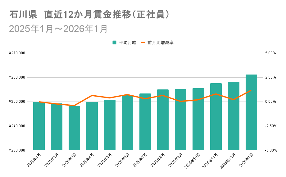 1位の石川県と47位の福島県における直近12か月の賃金推移を比較すると、石川県の平均月給は2025年1月の249,888円から上昇基調で推移し、2025年11月には257,604円に到達。2025年12月は258,142円、2026年1月には261,158円と期間中の最高値を記録しています。