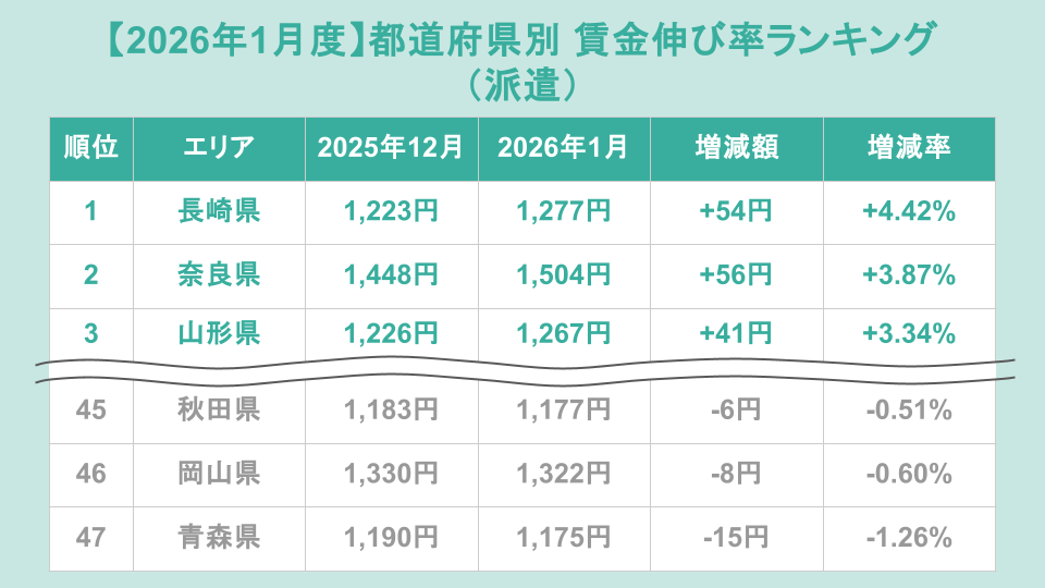 派遣の都道府県別賃金伸び率ランキング(前月比)トップ3は、1位が長崎県(増加額+54円、増加率+4.42%)、2位が奈良県(増加額+56円、増加率+3.87%)、3位が山形県(増加額+41円、増加率+3.34%)でした。