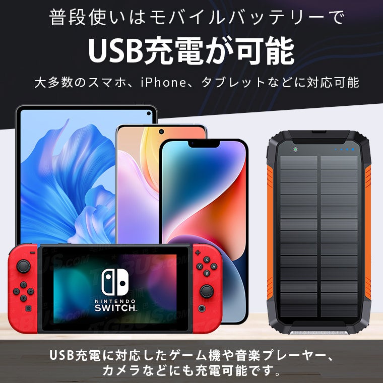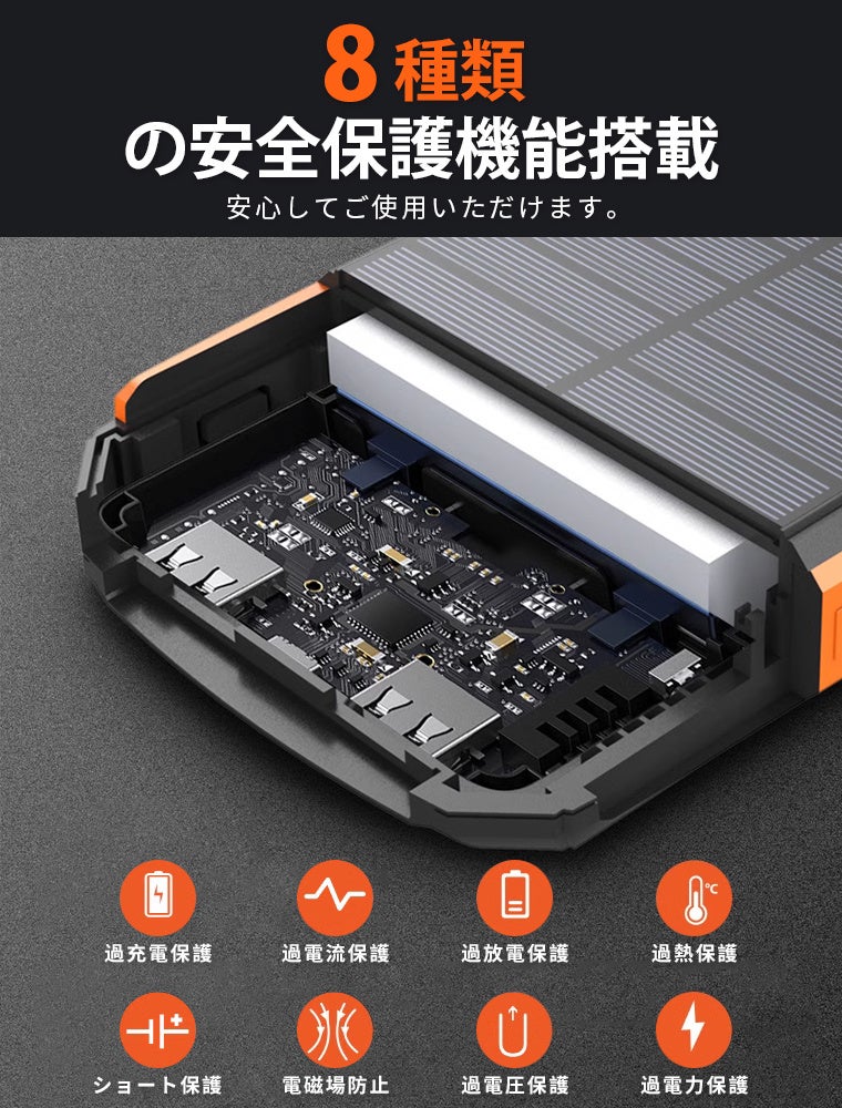 太陽光充電に対応した大容量設計で、停電や災害時でもスマートフォンなどの電子機器を充電できる防災対応モデルです。
