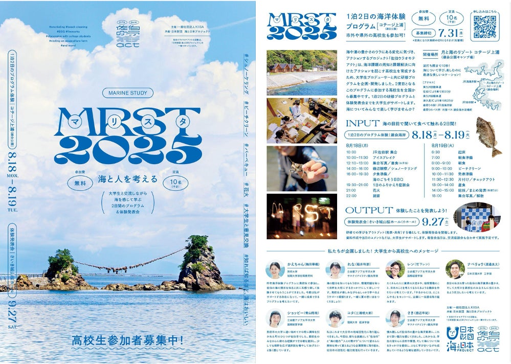 一般社団法人KIISAは、高校生向け海洋体験イベント「マリスタ2025 -人と海を考える-」を開催いたします。2025年8月18日(月)~19日(火) 1泊2日のプログラム体験、そして体験での気づきの発表・共有する場として9月27日(土)の体験発表会を通じ、海を知り・学び・考える海洋体験プログラムです。このイベントは、次世代へ豊かで美しい海を引き継ぐために、海を介して人と人とがつながる“日本財団「海と日本プロジェクト」”の一環です。