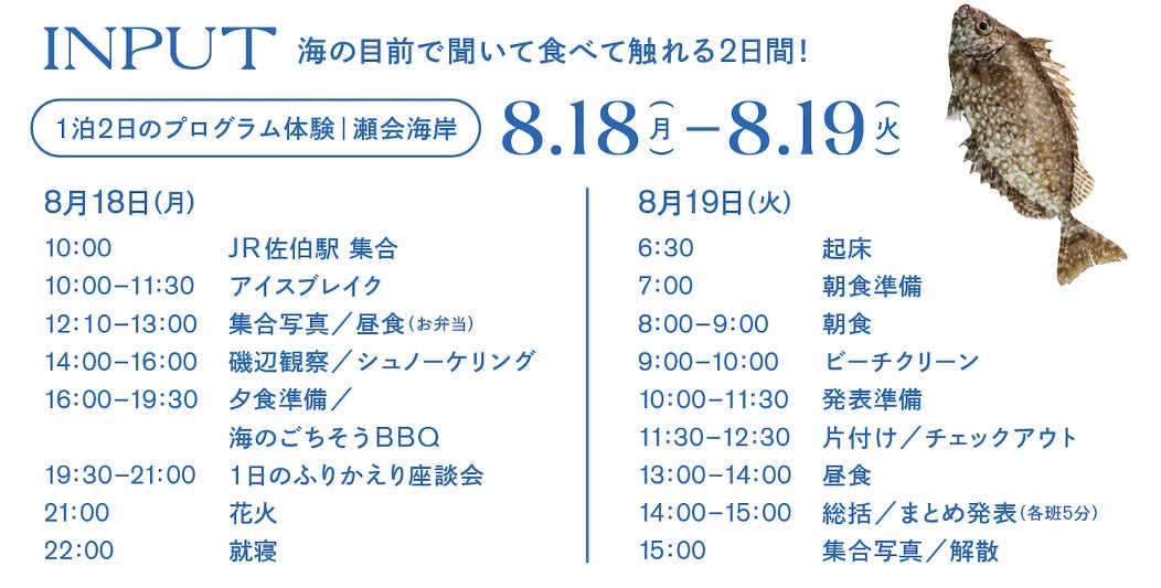 また、9月27日(土)にさいき城山桜ホールにて開催する体験発表会では、1泊2日の体験プログラムを通して感じたことや考えたこと、その後に起きた海に対する気持ちの変容などについて、参加高校生からの発表をしていただくアウトプットプログラムを予定しております。