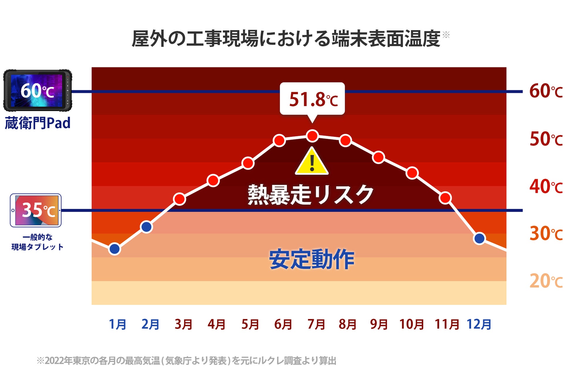 屋外の工事現場でタブレットを利用すると、外気温だけでなく直射日光によりタブレットの表面温度は急激に上昇します。ルクレ調査では、表面温度は外気温度+15度となるため、酷暑の真夏を想定した場合タブレットに求められる動作環境は60度です。一般的なタブレットの動作環境は35度であり、3月から11月の現場利用で熱暴走が発生する可能性があります。そのため、酷暑の現場で使える耐熱仕様のタブレットを開発しました。