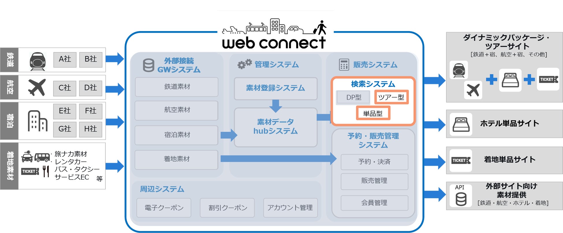 webコネクトは、2020年4月より大手航空2社によって導入された新IIT運賃に対応した販売プラットフォームとしてスタートしました。ダイナミックプライス型旅行商品のリアルタイムな料金計算と高速な一覧表示を実現しています。また、旅行業界の構造改革に伴う各社の課題を解決するため、サービス基盤を共通化し、必要な機能のみをSaaS提供するというコンセプトで、機能拡張を重ねています。