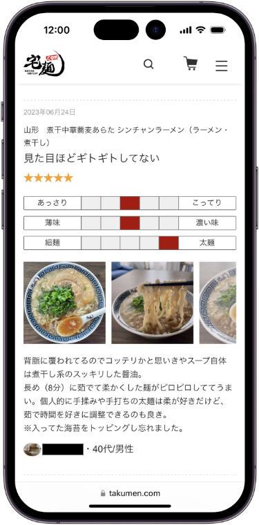 以前より各商品ページごとに当社基準で「あっさり・こってり」「薄味・濃い味」「細麺・太麺」などのチャートを掲載していましたが、ユーザーも商品レビュー内に独自基準のチャートを掲載し、より詳細な記録を残せるようになりました。また、他のユーザーにとっても商品を選ぶ際の参考としてより一層ご活用いただけます。