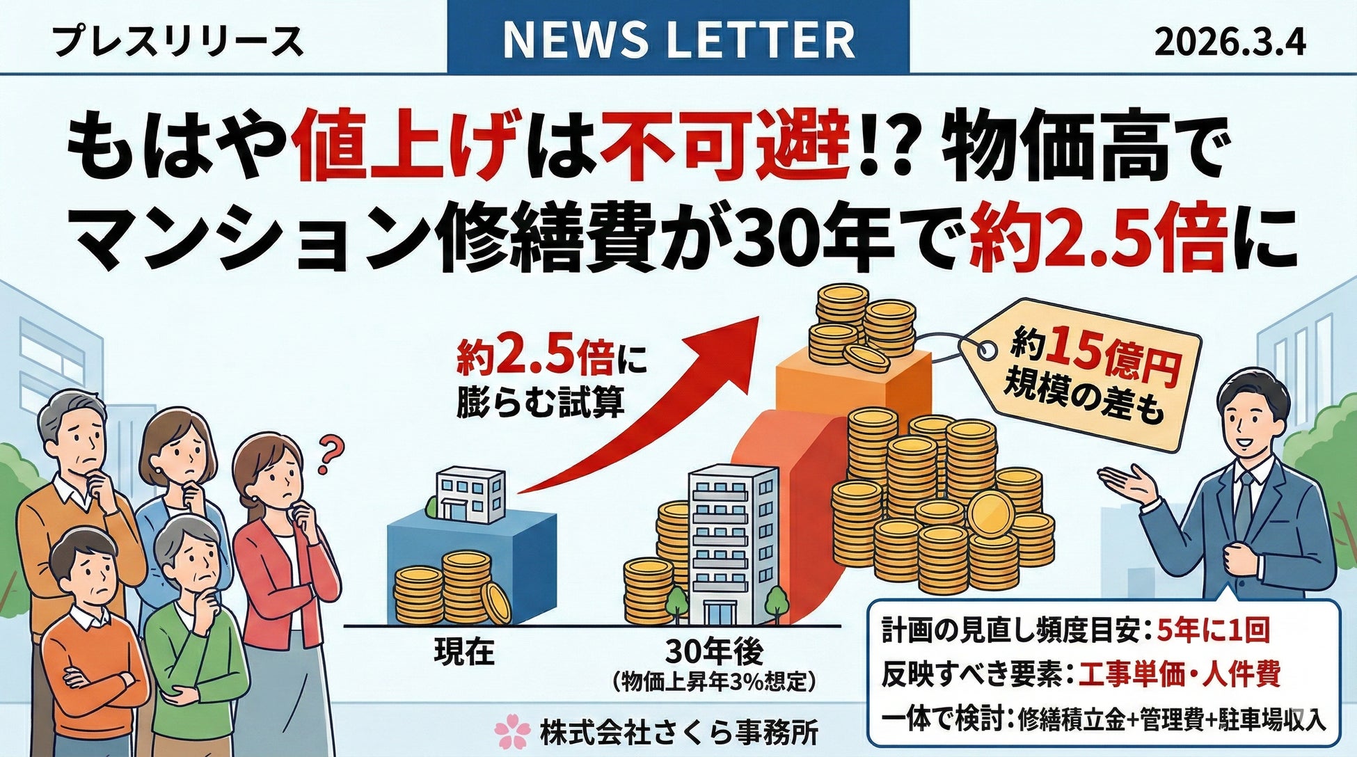 従来型の長期修繕計画のままでは、将来的に資金不足や急激な積立金の値上げを招く可能性があり、計画の前提そのものを見直す必要性が高まっています。本件に関するお問い合わせ・取材のご依頼がありましたら、お気軽にご連絡ください。