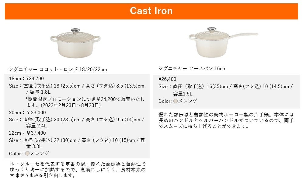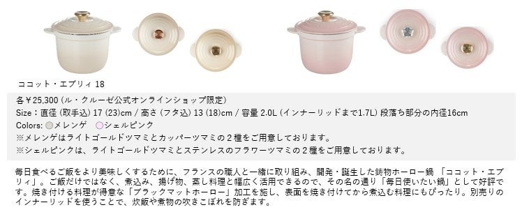 ニュートラルで淡いグラデーションが特長の「メレンゲ」は、どんな色とも相性抜群のカラー。鋳物ホーローウェアは、定番の「シグニチャー ココット・ロンド」に加え、期間限定で「シグニチャー ソースパン」が登場。どちらもステンレスツマミを採用しています。