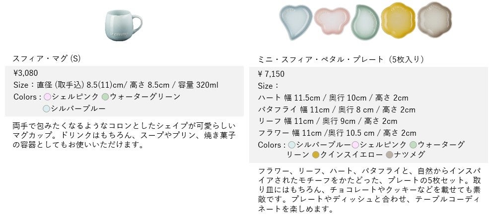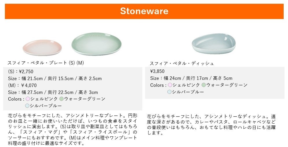 鋳物ホーローウェアよりニュートラルで淡いグラデーションが特長の「メレンゲ」シーズナルカラーとして登場。ストーンウェアは、「シェルピンク」と「ウォーターグリーン」に加え、日本開発の新色として、グレイッシュで透明感のある「シルバーブルー」が登場します。新シェイプの「スフィア・ペタル・プレート」や「スフィア・ペタル・ディッシュ」は、花びらをモチーフにしたアシンメトリーなフォルムが特長で、組み合わせ方によって可愛らしい雰囲気やシックな表情などに変化が生まれます。