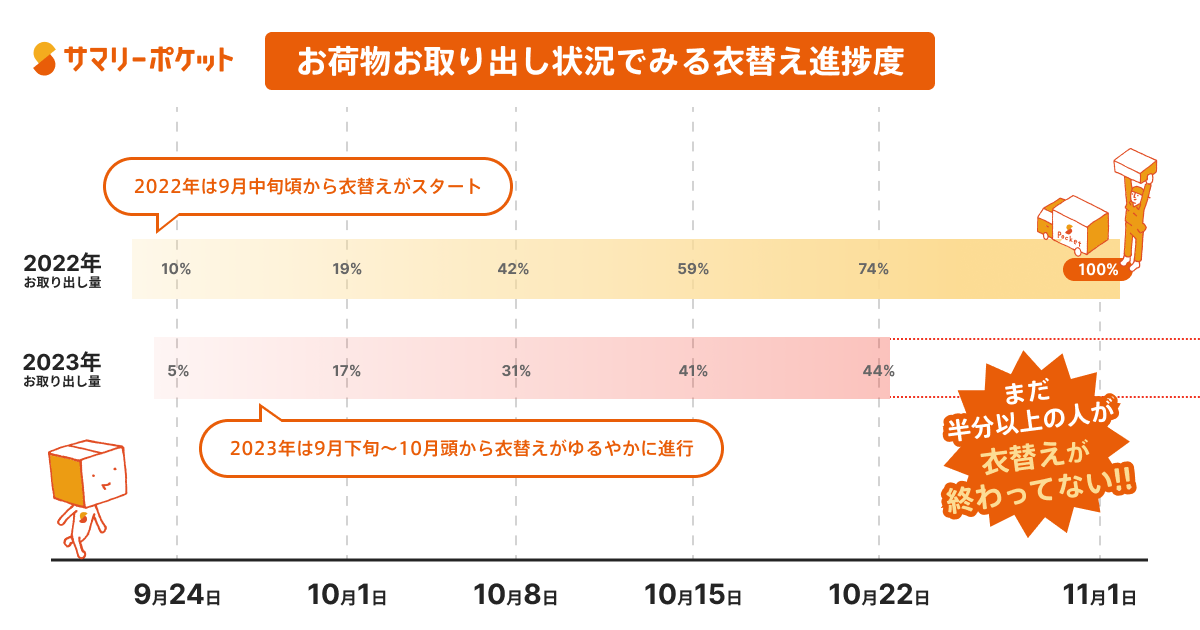 最低気温が20度前後を下回る日が続くと、宅配収納「サマリーポケット」では秋冬物を預けられているお客様の多くがお荷物をお取り出しし、春夏物と入れ替えて預ける「衣替えシーズン」となります。例年に比べ暖かい時期が10月頭まで続いたことから、2023年は緩やかな衣替え傾向が見られますが、10月に入り、9月と比較してサマリーポケットの荷物のお取り出し件数が約2.7倍上昇しています。