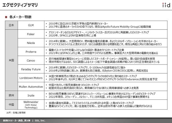 本レポートでは、京都大学発の新興EVメーカー「GLM」をはじめ、米国の「Nikola」やBEVに関連するモジュラー・ソリューション事業を手掛けるスウェーデンのEVスタートアップ「Inzile」など10社の企業動向・代表車種といった情報をまとめ、SWOT分析を用いて事業の現状・今後の課題などを分析した。