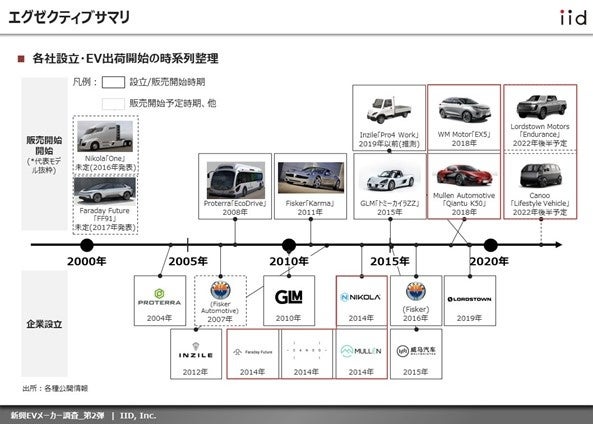 今回の調査対象の中では、米国の電動の大型商用車専門メーカー「Proterra」が最も早く、2004年に設立した。同社は、2008年にEVバス『EcoDrive』の販売を開始している。その後、2010年代になると米国を中心にEVベンチャーが続々と登場している。