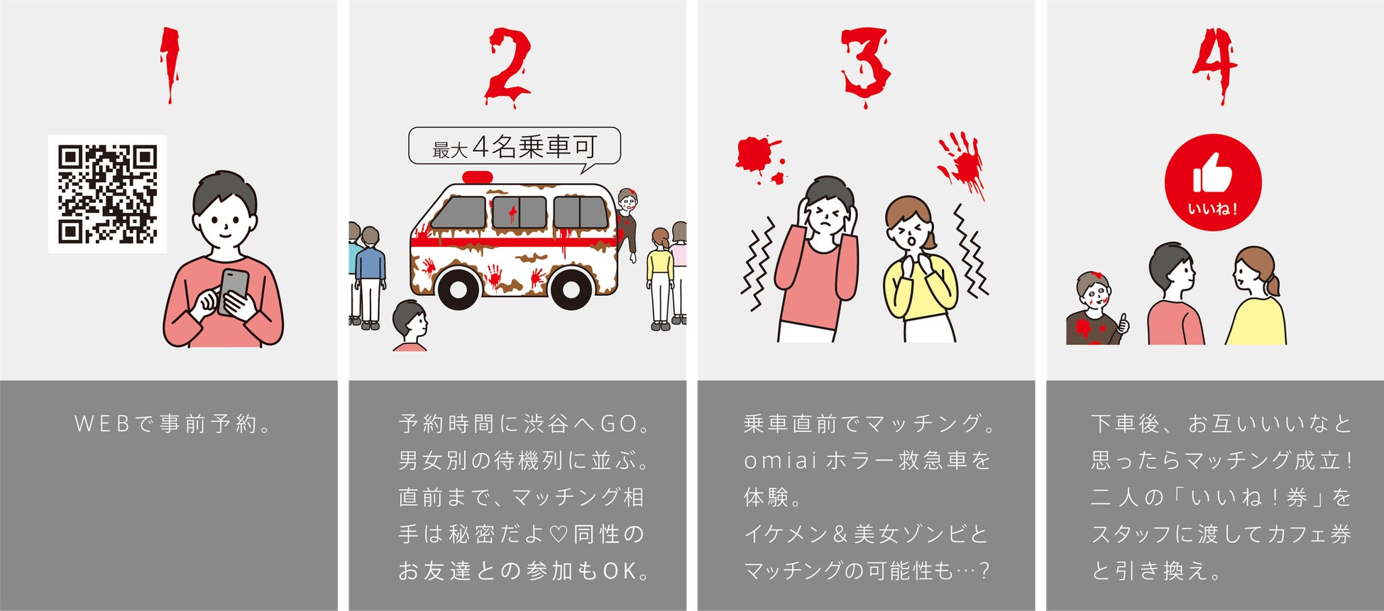 ③お申込みいただいた運命の見知らぬ男女が、その場でマッチングされ、Omiaiホラー救急車を体験