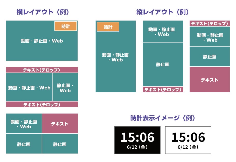 5)最大8分割まで画面分割が可能。また、分割画面ごとに「時計」や「テキスト」を表示する設定も可能
