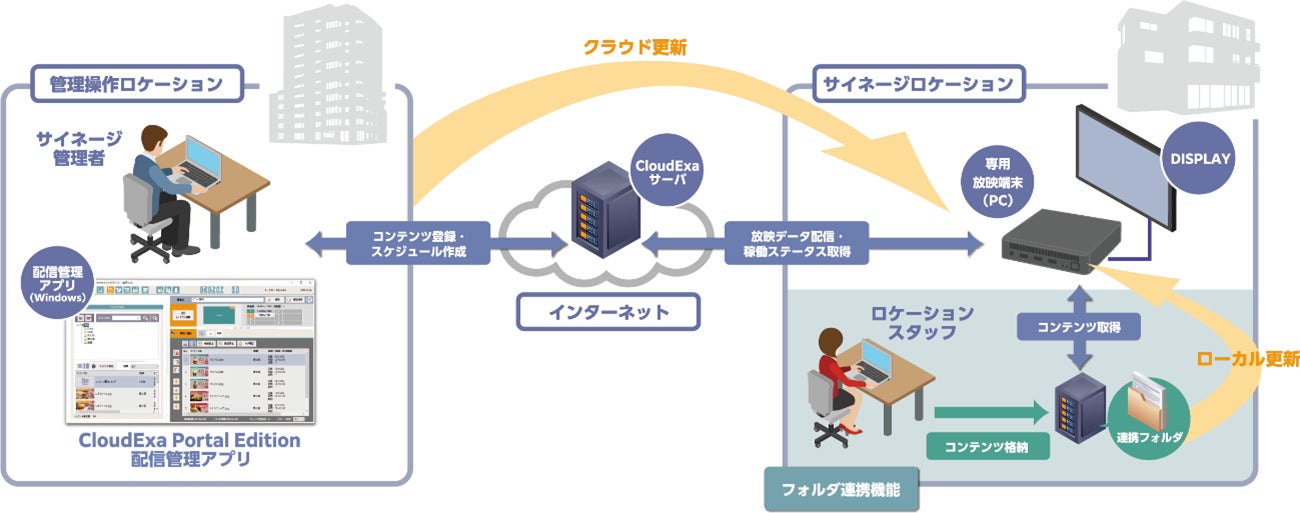 CloudExa(クラウドエクサ)は、クラウド型デジタルサイネージ配信管理システムシリーズです。この度販売を開始するポータルエディションは、クラウドサーバからの配信だけでなく、放映端末のローカルネットワーク内にあるフォルダにコンテンツを追加・削除するだけで放映内容を更新できる機能が実装されました。これにより、サイネージ管理者ではなくロケーションスタッフが簡単にコンテンツ更新を行えるようになっています。また、従来のように管理ユーザとサブユーザで管理できる放映端末の割り当てを設定し、権限を分けた運用も行うことができます。これらの仕組みにより、多様な運用方法の選択肢を利用者に提供し、柔軟で効率的な情報の発信を実現します。