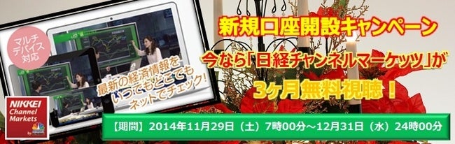 当社では2014年11月29日(土)より新規に口座開設頂いたお客様を対象に、「日経チャンネルマーケッツ」が最大で3ヶ月間無料で視聴頂けるキャンペーンを実施いたしました。