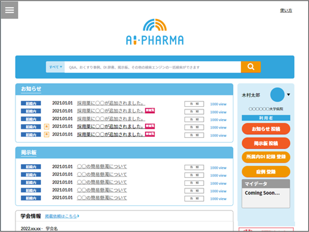 ・問合せ事例、薬学的介入事例などの情報をデータベース化でき、お知らせ機能による情報配信や、掲示板機能による薬剤師同士の双方向性の情報共有が可能