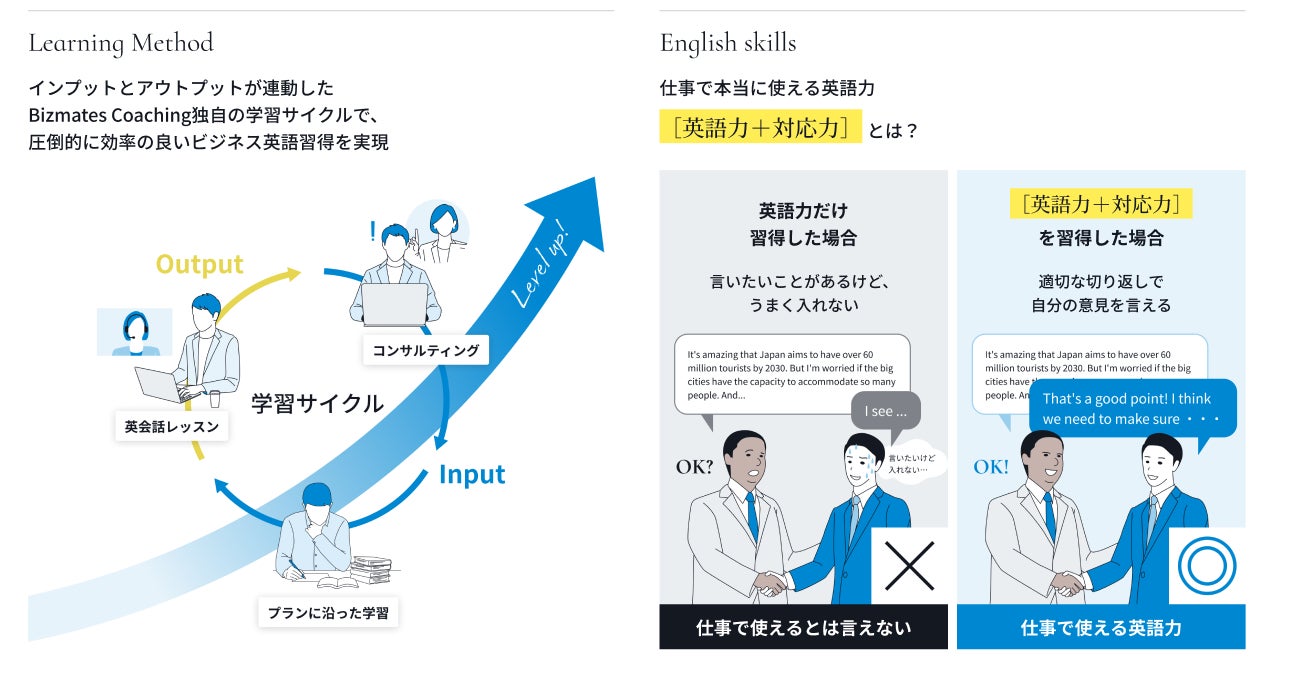 当社では、ビジネス特化型オンライン英会話「Bizmates」の学習効果を最大化させるため、オンライン英会話レッスンに加え、受講生一人ひとりに最適な学習内容をご提案し、目標達成に向けて伴走する「Bizmates Coaching」を提供してまいりました。「Bizmates Coaching」では、日本人の専任コンサルタントが英語力を細かく分析し、各人の達成目標とライフスタイルに合わせたに最適な学習プランを提示。毎日のオンライン英会話レッスンも組み込まれた学習サイクルの中で、最短ルートでの実践的なビジネス英語の習得の場を提供できる点が特長です。インプットとアウトプットの環境が一気通貫に連動しているため、グローバルなビジネスシーンで活躍できる、英語力と対応力を効率良く身につけることができます。