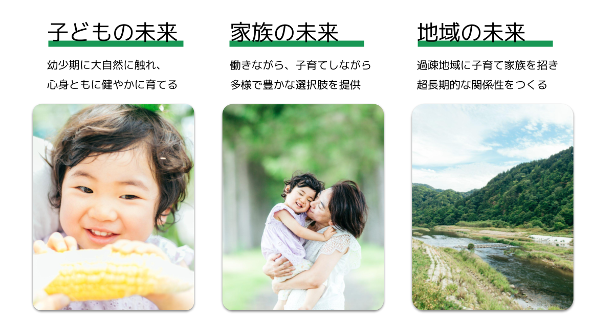 お子様には、幼少期に大自然に触れ、心身ともに健やかに育つ環境を、ご両親は働きながら多様な選択肢を、さらに過疎地域に、子育て家族を招き、地域経済に貢献をもたらします。
