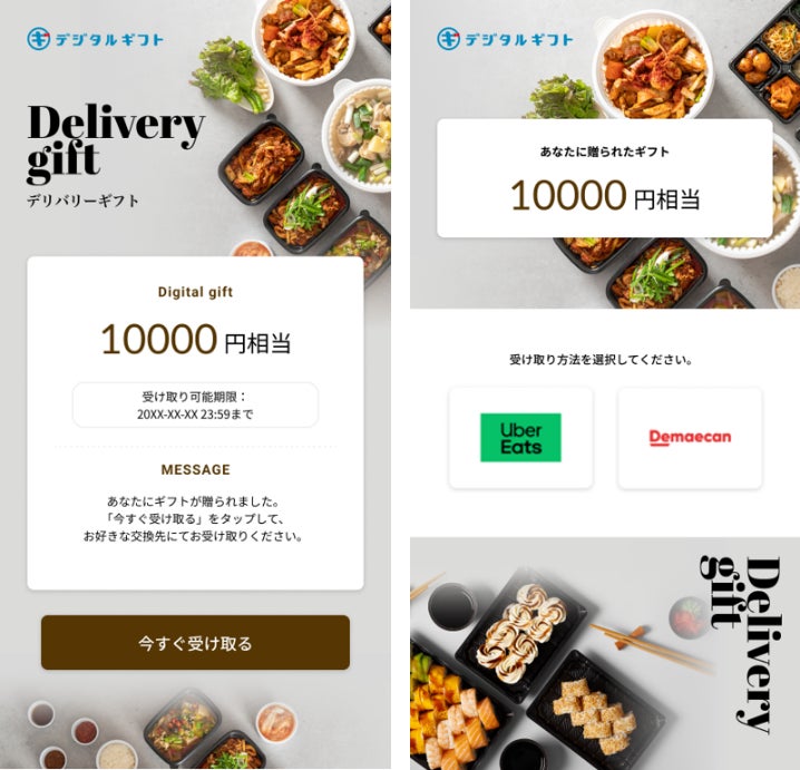 デリバリーギフトを贈られた人は、お住まいのエリアで展開中の Uber Eats や出前館を通じて、贈られた金額分の注文を自由に行うことができます。