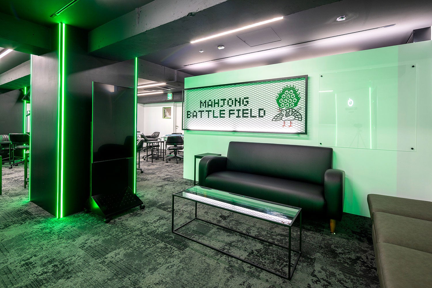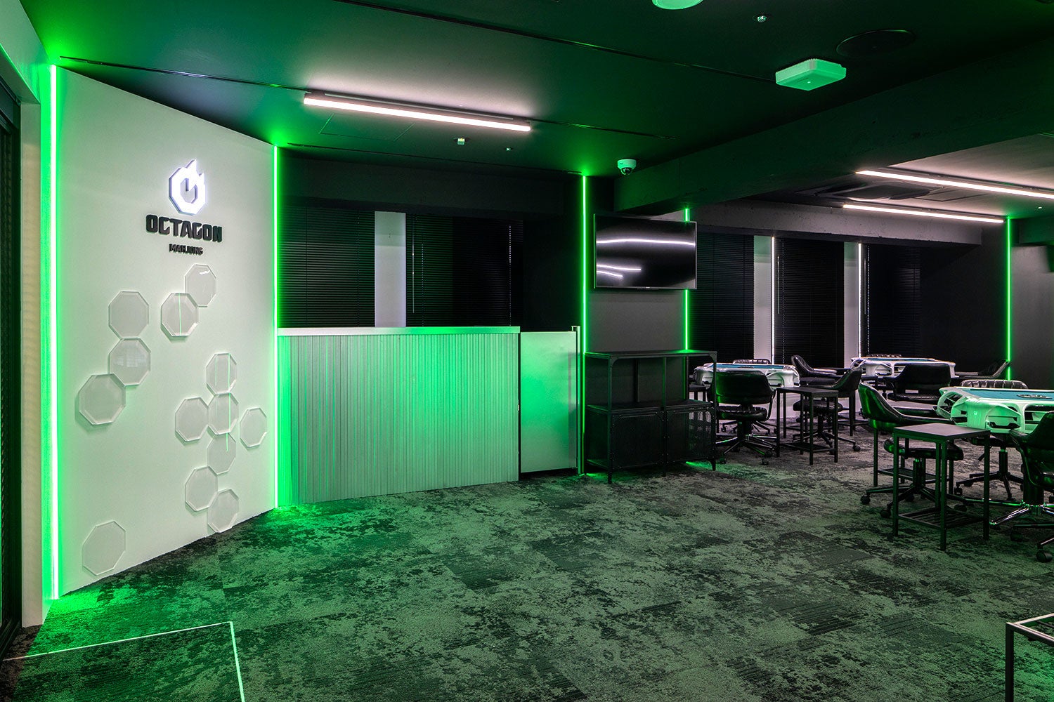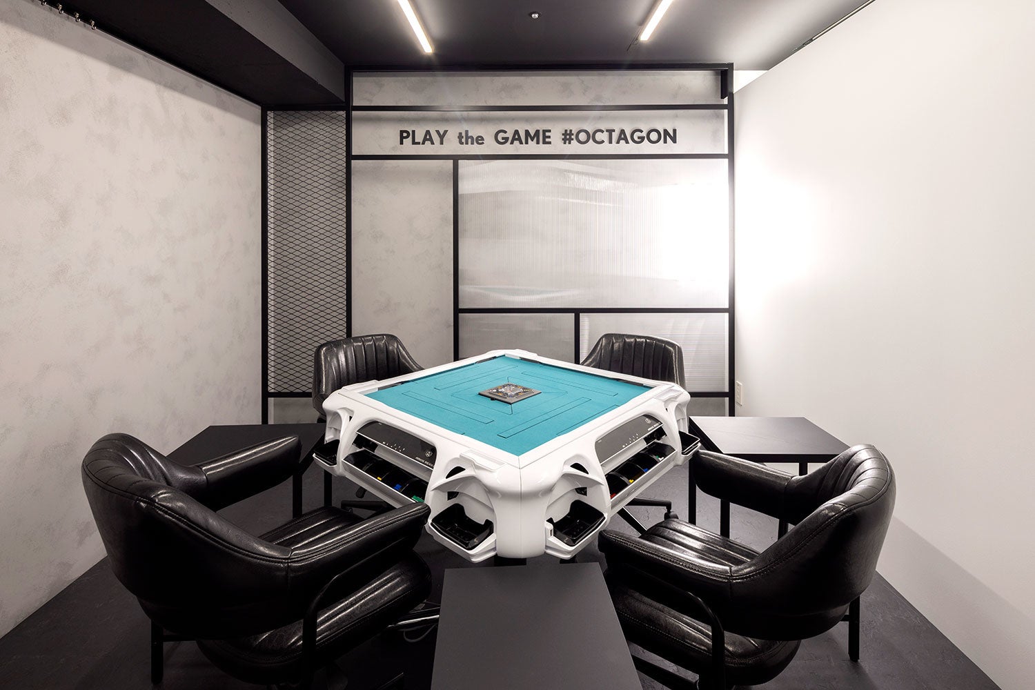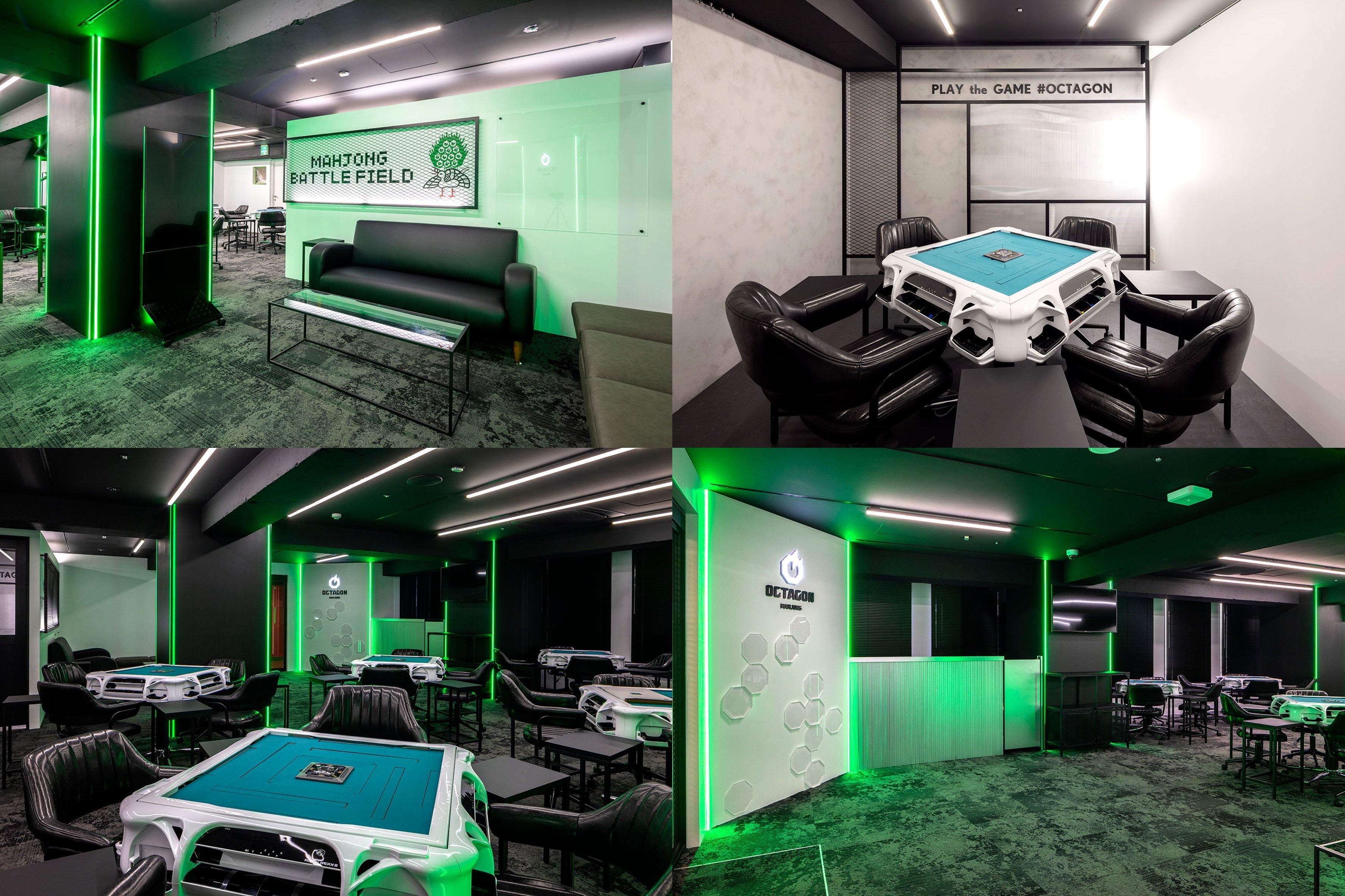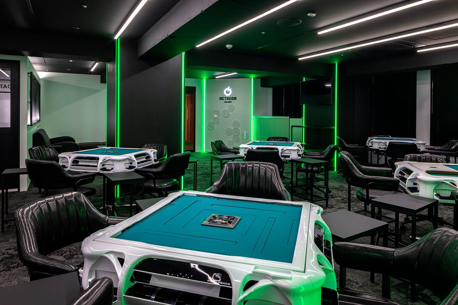 内装は黒を基調にグリーンをアクセントとしたe-Sportsを彷彿とさせるデザインとし、クリーンなマインドスポーツとしての麻雀とデジタル事業を中心に最先端で活躍するサイバーエージェントグループのイメージを融合させ、これまでの麻雀が持つイメージを払拭した新しい麻雀店としての設えにしました。また、これまで培ってきた「麻雀オクタゴン」の歴史も大事にするため、以前のロゴにあった金網やイーピンの要素もデザインに採用しています。