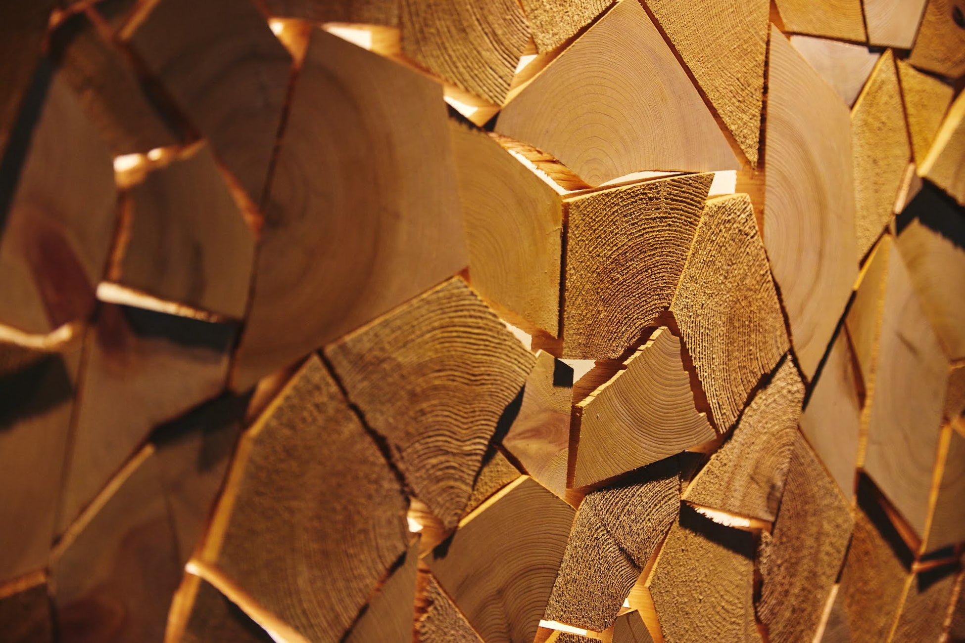 ヒノキやスギの表面からは、すべすべとした「木の温かみ」、反対に荒々しくザラザラとした「木の力強さ」、またあえて切断するのではなく割ることで出る「ゆがんだ曲線」など、豊かな素材感を感じられます。