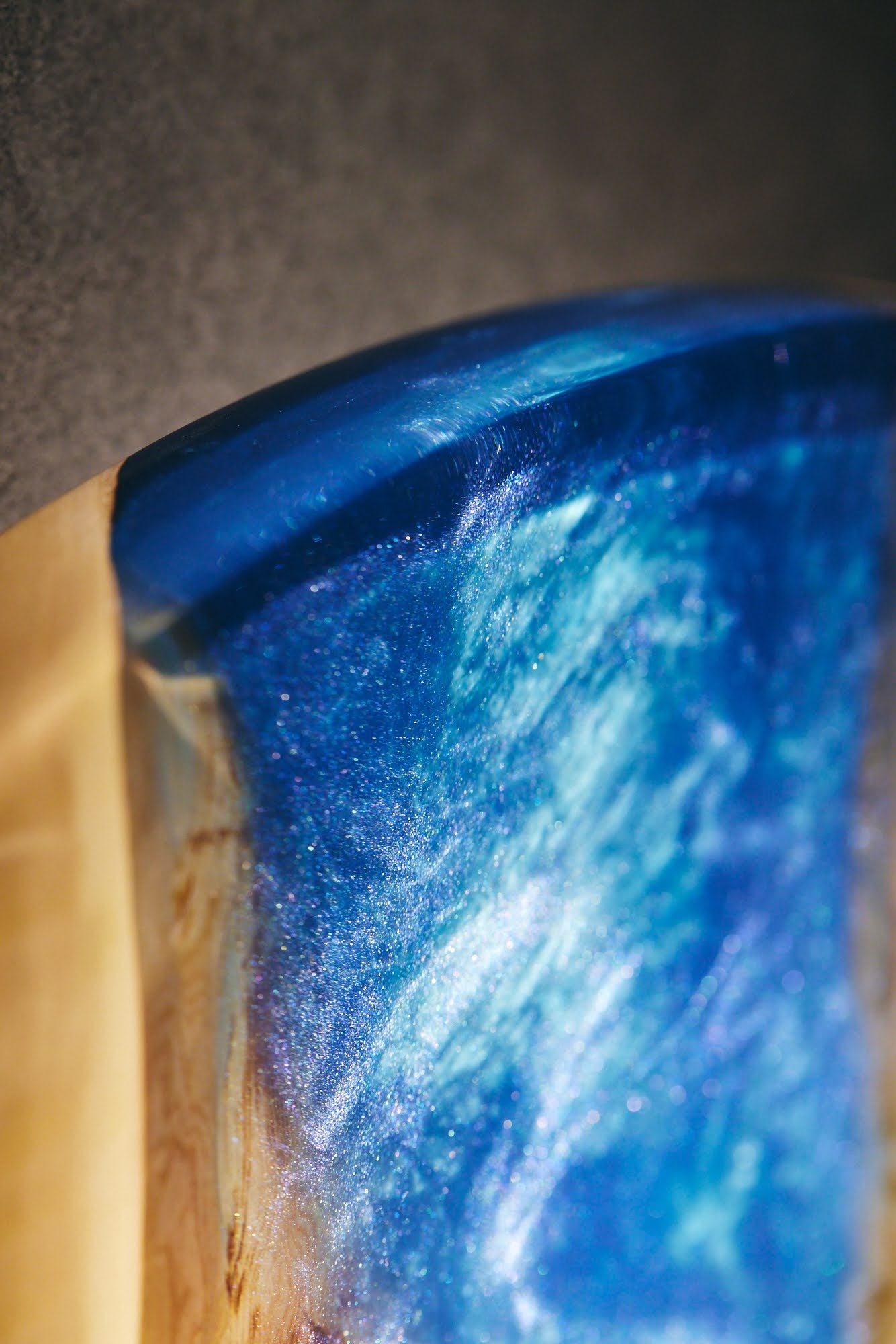 7階のペントハウス専用のアプローチには、特別感を感じられる演出として、国産のトチとレジンが融合するアートを制作しました。リバーテーブルの技法を用いて、川の流れのように天然木にレジンを流し込み、何層にも重ねて色味を調整することで、自然の景色を模した透明感を出しました。