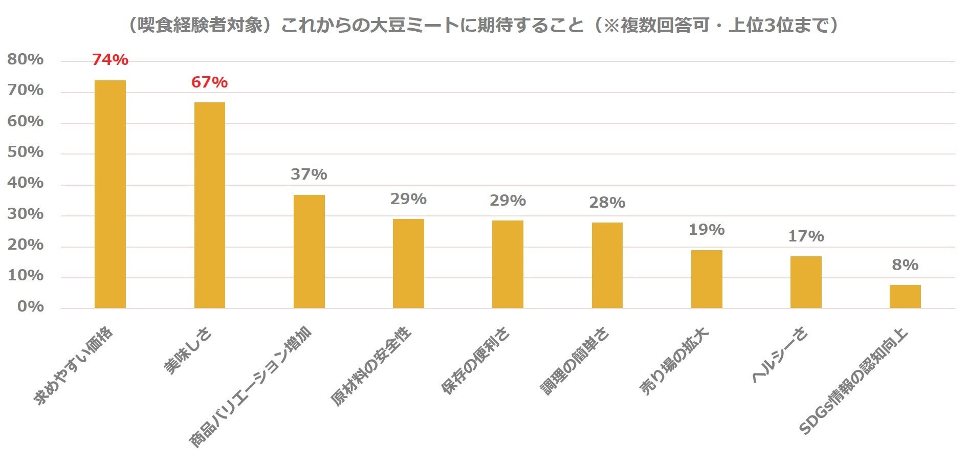 喫食経験者にさらに聞いた、これからの大豆ミートに期待することは、「求めやすい価格」(74%)と、「美味しさ」(67%)が上位を占めました。また、商品の多様性や原材料の安全性、簡便さなどの利便性もさらに求められていることがわかります。