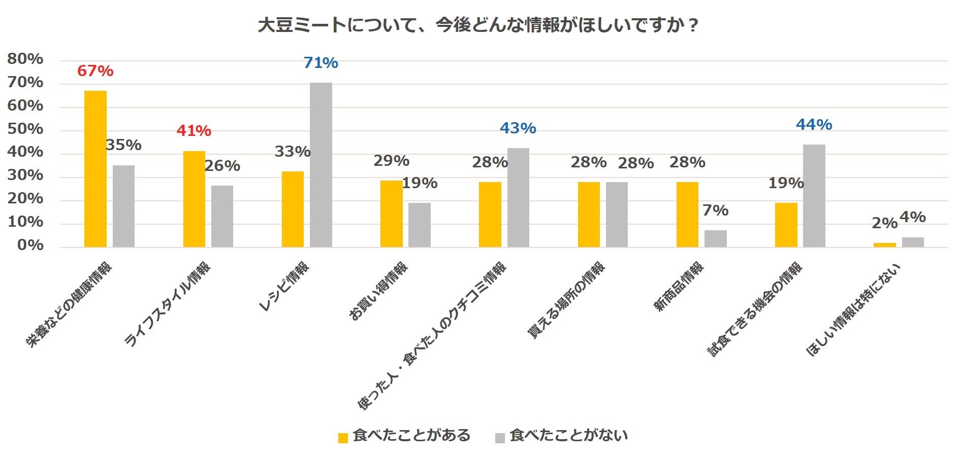 また、今後大豆ミートについてほしい情報を聞いたところ、喫食経験者は「栄養などの健康情報」(67%)、「ライフスタイル情報」(41%)が上位に上がったのに対し、喫食未経験者は「レシピ情報」(71%)、「試食できる機会の情報」(44%)、「食べた人のクチコミ情報」(43%)が上位に挙がり、大きく傾向が異なる結果となりました。喫食未経験者へのトライアルを増やすには、レシピ情報やクチコミ情報の拡充とアクセシビリティの向上、気軽にお試しできる店頭での試食やイベントの増加が寄与すると言えそうです。