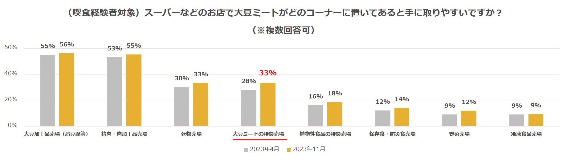 まだ新しい食品「大豆ミート」、過去調査では生活者からは「お店のどこで買えるのかわからない」といった悩みが多く見られました。そこで喫食経験者に「手に取りやすい店内コーナー」について聞いたところ、前回調査同様に「大豆加工品売場」(56%)、「精肉・肉加工品売場」(55%)と回答した方はいずれも半数以上に上り、それに次ぐ「乾物売場」(33%)と並んで「大豆ミートの特設売り場」(33%)が前回より+5ptと伸長する結果となりました。「乾物」でも「肉の代わり」でもない「大豆ミート」という新カテゴリが、家庭料理の選択肢として確立しつつあると見ています。