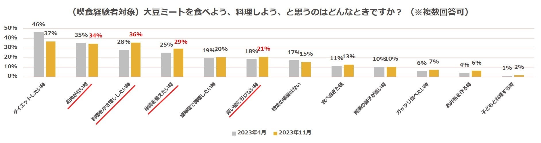 また喫食経験者を対象に、大豆ミートの調理・喫食シーンについて調査したところ、前回は最多の46%だった「ダイエットしたい時」は▲9ptの37%にとどまり、続く「お肉がない時」(34%・前回比▲1pt)、「料理をかさ増ししたい時」(36%・前回比+8pt)が迫る結果となりました。他にも「体調を整えたい時」(29%・前回比+4pt)、「買い物に行けない時」(21%・前回比+3pt)など、より生活に密着した実用的なシーンでの活用シーンが増えていることがわかります。