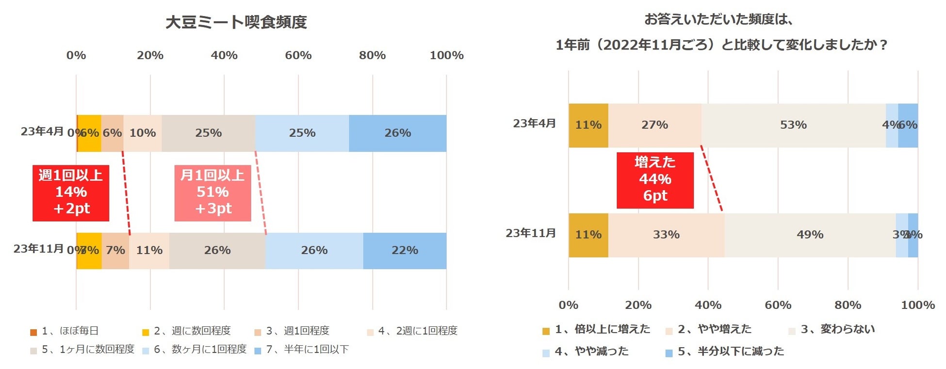 喫食経験者に現在の喫食頻度と、1年前との変化を聞いたところ、喫食頻度は「週1回以上」が14%(前回比+2pt)、「月1回以上」が51%(前回比+3pt)と上昇が見られ、「1年前と比較して喫食頻度が増えた」と回答した方は44%(前回比+6pt)となりました。約半数の49%は「変わらない」と回答しているものの、「減った」の回答は6%にとどまることから、全体の喫食総数は増加していると見ています。