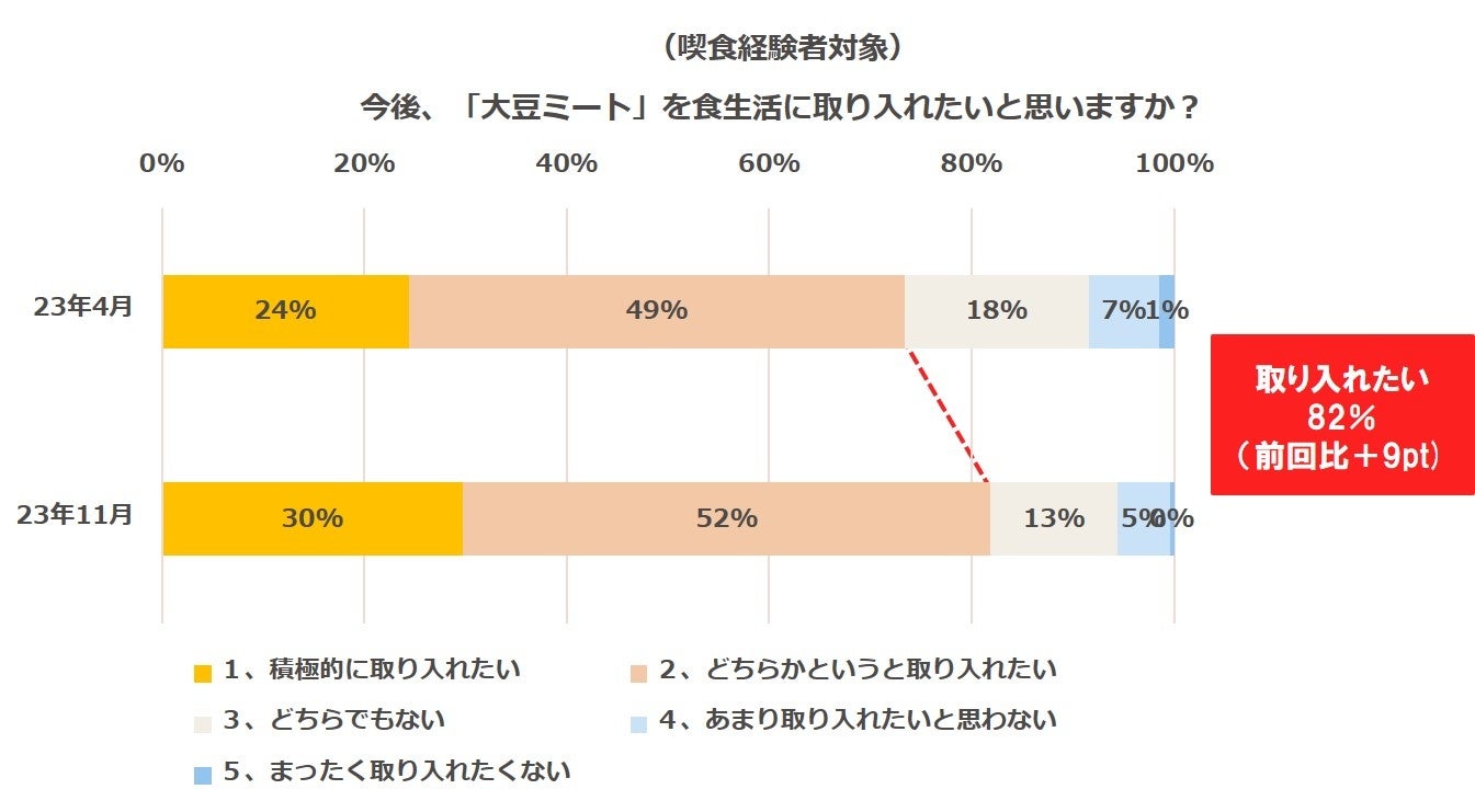 上記を踏まえた今後の大豆ミートの喫食意向は82%が「食生活に取り入れたい」と回答。前回より9pt上昇し調査開始以最高となりました。また希望する使用頻度については、「週1回以上」の回答割合が34%(前回比+4pt)、「1ヶ月以上」が72%(前回比+8pt)と、頻度(使用量)の増加傾向がみられ、より家庭料理での使いこなしが進んでいることがわかります。