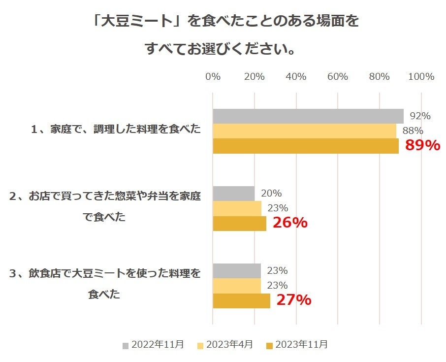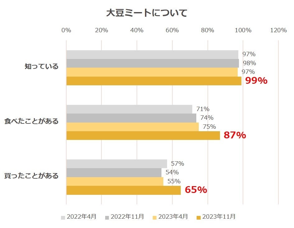 4回目となる「大豆ミート」に関する意識調査では、知っている人は99%、食べたことがある人は87%(前回比+12pt)、大豆ミートそのものや、大豆ミートを使った食品等を購入したことがある人は65%(前回比+10pt)とどの指標も調査開始以来の最高値を記録しました。
