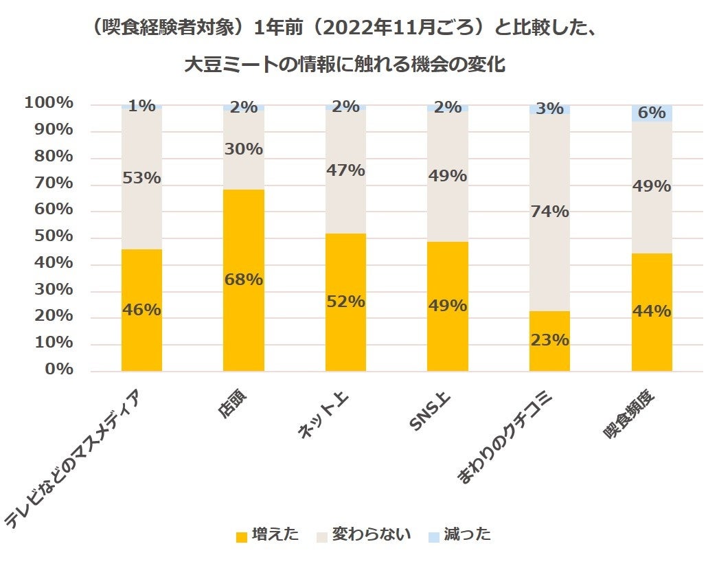 大豆ミートの情報に触れる機会について1年前との変化を聞いたところ、「増えた」と感じる情報経路が最多となったのは「店頭」(68%)、ついで「ネット上」(52%)、「SNS上」(49%)、「テレビなどのマスメディア」(46%)となりました。大豆ミートの喫食頻度が「増えた」と回答した44%とも値が近く、こうした生活に身近な場所で大豆ミートの情報に触れる機会の増加が、喫食経験者の喫食度頻増の要因のひとつとなったと見ています。