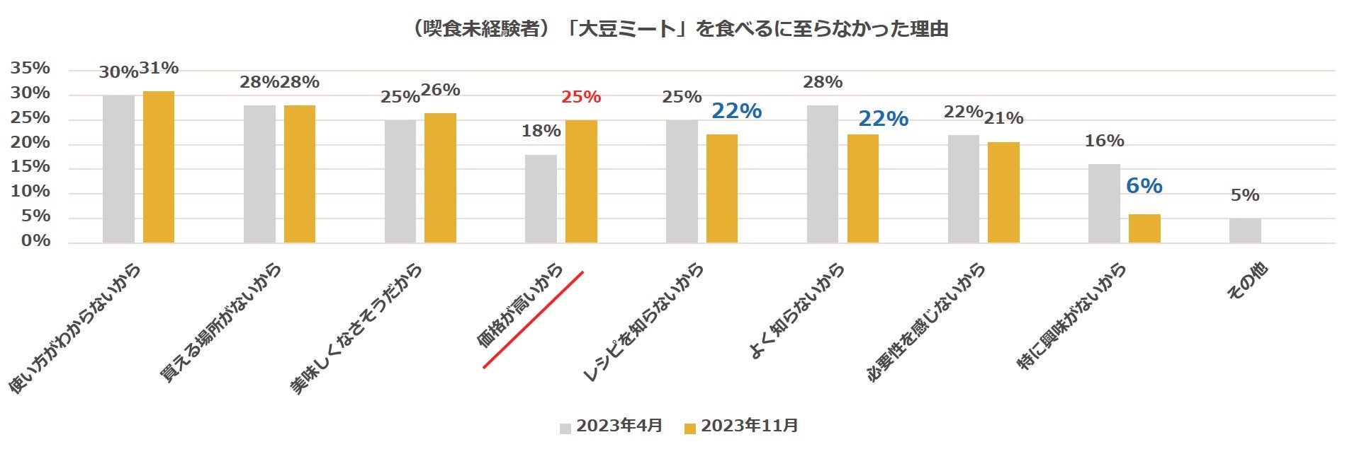 喫食未経験の要因は、物価高騰による節約志向も影響。一方で、情報不足は徐々に解消の兆し。普及に向けた次なる課題は、調理・試食のトライアルと商品接点の拡大。