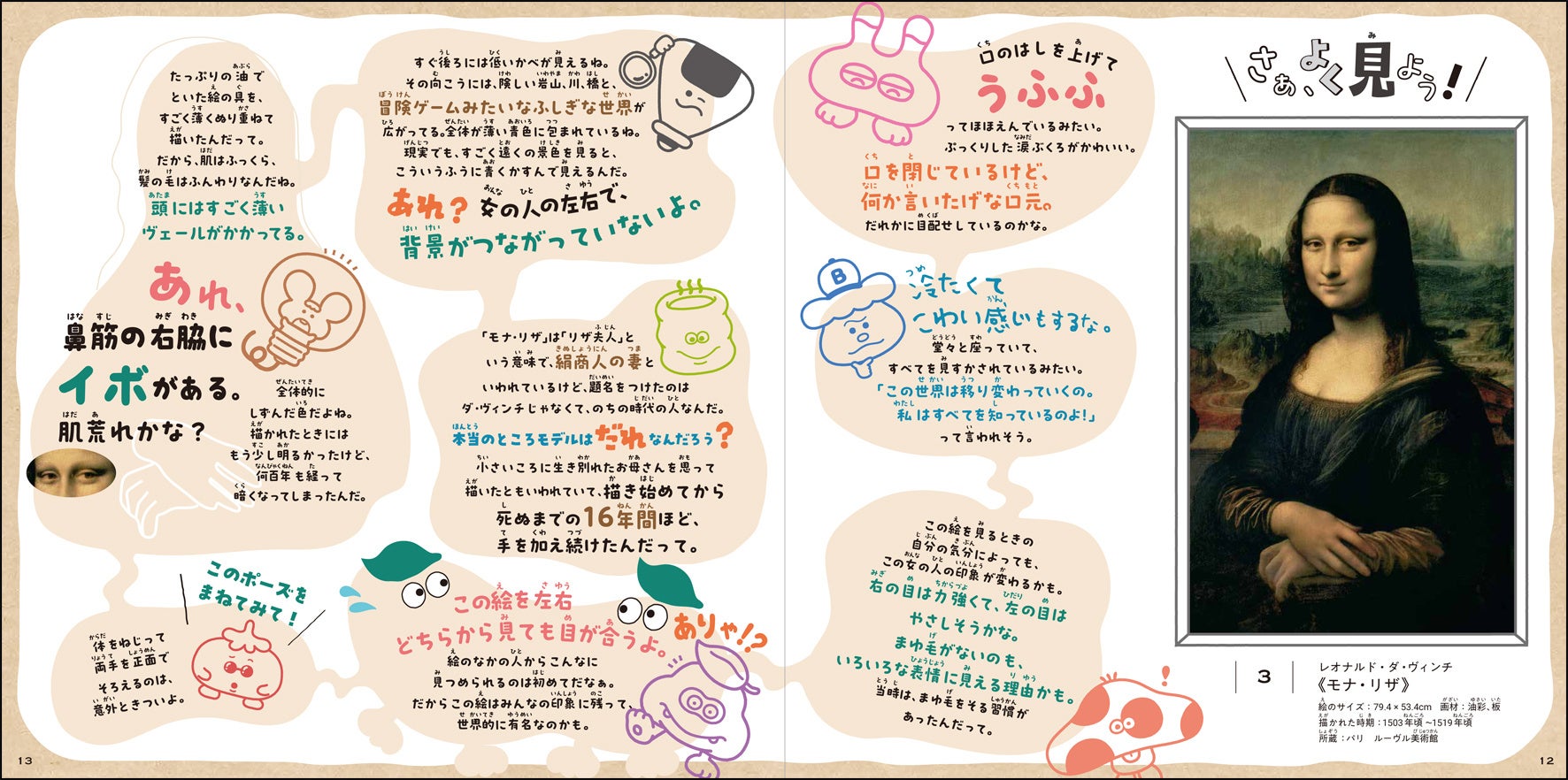 まずは自分ひとりで一枚の名画をじっくり見ることで、感じることや気づくことがあるはずです。その後に、登場するキャラクターたちの様々な意見を聞くことで、「そんな見方もあるんだ!」「自分では気が付かなかった!」と思えるような、多様な絵の見方を知ることができます。また、研究でわかっている情報なども学べます。