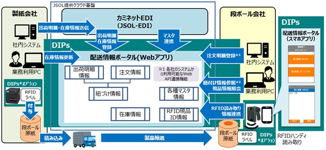 株式会社JSOL(本社:東京都千代田区、代表取締役社長:永井 健志、以下、JSOL)は、製紙業界と段ボール業界における物流の2024年問題に対処すべく、RFIDを活用した配送情報ポータルシステム(以下、DIPs(Delivery Information Portal System))の開発を行いました。日本製紙連合会(以下、製紙連)と全国段ボール工業組合連合会(以下、全段連)がDIPsの導入を推進し、製紙業界標準EDI(電子データ交換)を展開する株式会社カミネットがDIPsの提供を行います。DIPsを活用いただくことで、製紙会社が段ボール会社に段ボール原紙を納品する際に行われる作業を効率化でき、荷卸しから検収までの時間を短縮できます。