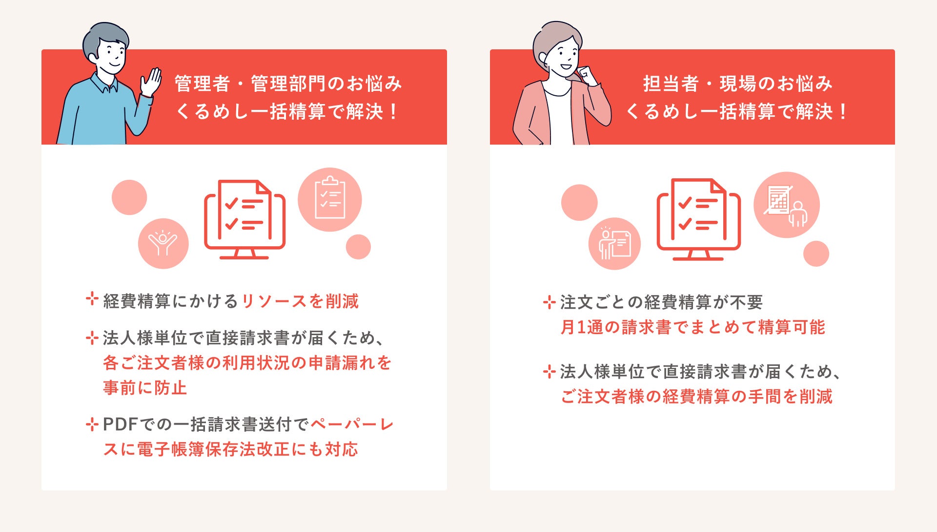 「くるめし一括精算」は、法人ごとにアカウントを発行し、請求書を月1枚に集約できるサービスです。複数の注文で発生する請求書を一括して精算できるため、管理が簡素化され、経理担当者・食事発注者双方の工数削減が可能になります。