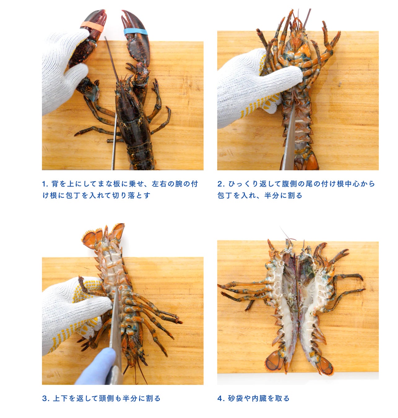 中心からまっぷたつに割って、塩・胡椒やハーブを散らし、フライパンでグリルするのも手軽な調理法です。活きたオマール海老は割るときに暴れることもありますので、充分注意してさばいてくださいね!