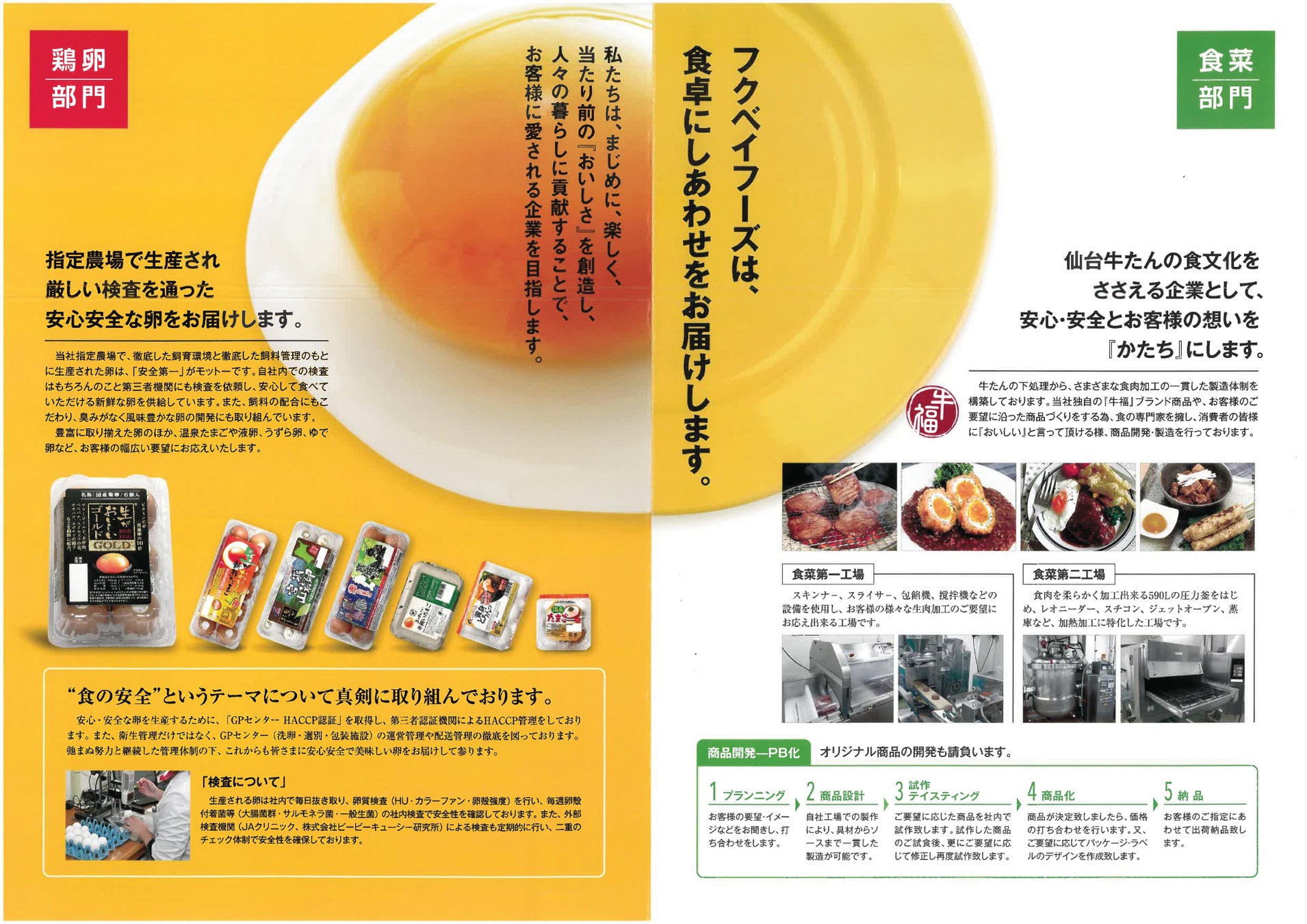 指定農場で生産され厳しい検査を通った安心安全なたまごや、地元の食文化に根づいた牛タンを中心に商品展開し、1973年の創業以来、社員全員が「正直な商品造り」「誠実な営業」「お客様に役立つ会社」という基本理念を日々忠実に守ることで、安全安心で楽しんでいただける食品の供給を実践しています。