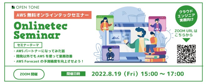 株式会社オープントーン (本社:東京都千代田区) はAPN(AWSパートナー)として、前回好評いただきました「AWS無料オンラインテックセミナー」の第二回目を2022年8月19日に開催いたします。