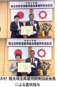 2022年9月16日(金)に開催された「令和4年度埼玉県障害者雇用優良事業所等表彰式」(主催:公益社団法人 埼玉県雇用開発協会)において、ポラスグループの特例子会社であるポラスシェアード㈱(埼玉県越谷市 代表取締役:中内晃次郎)の金野 昭(こんの あきら 50歳)と渡邊 富江(わたなべ とみえ 59歳)の2名が公益社団法人埼玉県雇用開発協会会長より「優秀勤労障害者」として表彰を受けました。