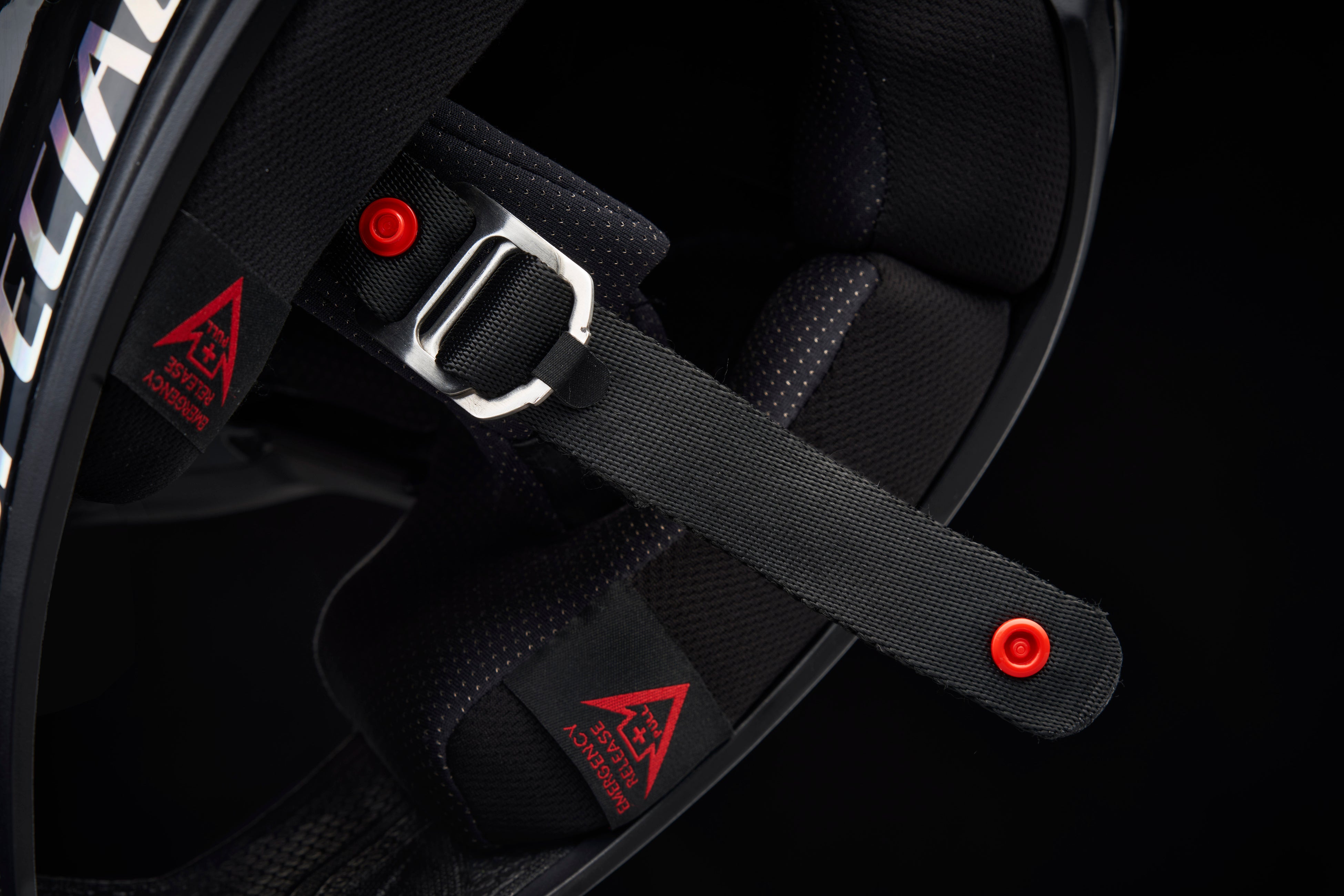 その内側には、フルフェイスヘルメット用に見直した構造を採用。5種類の密度をそれぞれ変えたEPS製フォームインサートをヘルメット内部の適所に配置。機敏な反応と疲労軽減に欠かせない軽量性を保ちながら、緻密に計算された衝撃吸収性能を発揮します。低密度のフォームは衝撃のエネルギーをより多く吸収し、頭部に伝わる力を軽減。さらに、Mips Evolve Solutionにより頭部に伝わる回転力を軽減し、信頼性を向上させました。このEvolve Solutionでは、内側にファブリック製ポケットアタッチメントを用いて、ライダーの集中力を欠く原因となるきしみ音の発生を軽減。さらに、緊急時には素早く着脱できるチークパットを採用し、安心感を与えます。