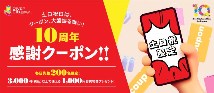 開業10周年を記念して、館内の各店舗にて、特別な割引やキャンペーン、ダイバーシティ東京 プラザ限定の商品などお得な情報が盛りだくさんです。